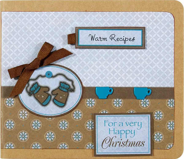 Glue the mittens oval to the left of the teacups and add a brow grosgrain bow with Zots. Print “Warm Recipes” on a blank label and glue a small brown ribbon tab on the left. Foam tape the label 1” from the top and 1 1/2” from the right. Foam tape “For a very Happy Christmas” 1/8” from the bottom and 1” from the right.