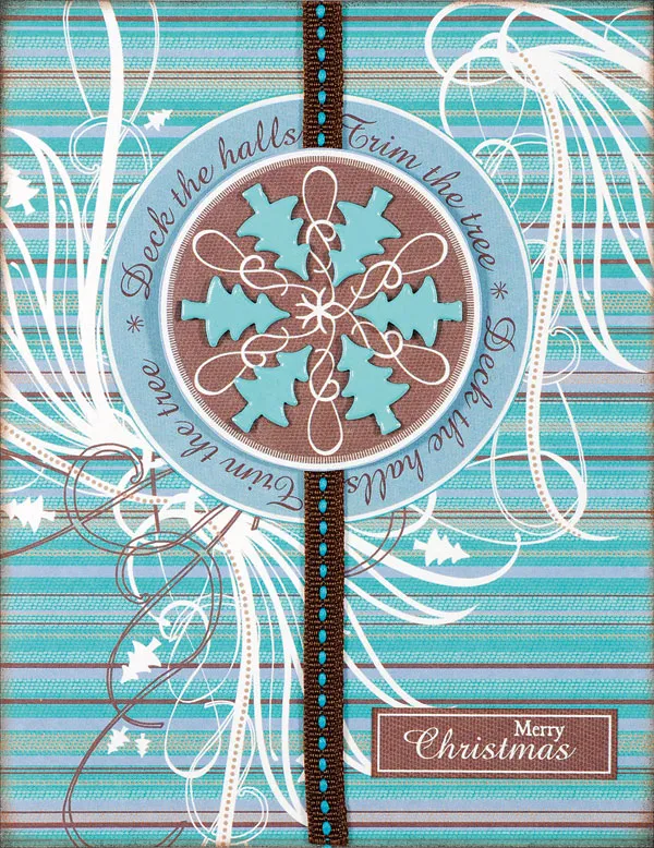 Glue the “Trim the tree…” blue art circle centered 5/8” from the top edge. Glue ribbon vertically down the center of the card front.