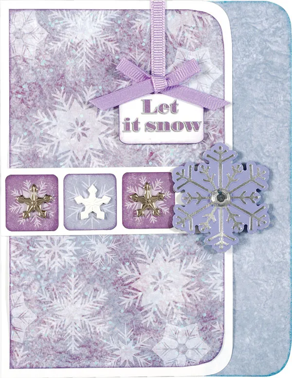 Cut 4”x1 1/8” of white cardstock. Cut out 3 snowflake squares and ink the edges with Wisteria. Glue them evenly spaced on the white strip. Insert 2 silver and 1 white snowflake brads into the snowflake centers. Glue the strip 2 1/2” from the bottom. Ink the edges of “Let it snow” and foam tape 2” from the left and 1 1/2” from the top.