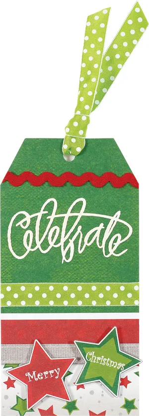 Foam tape the “Merry” and “Christmas” stars at the bottom of the tag.