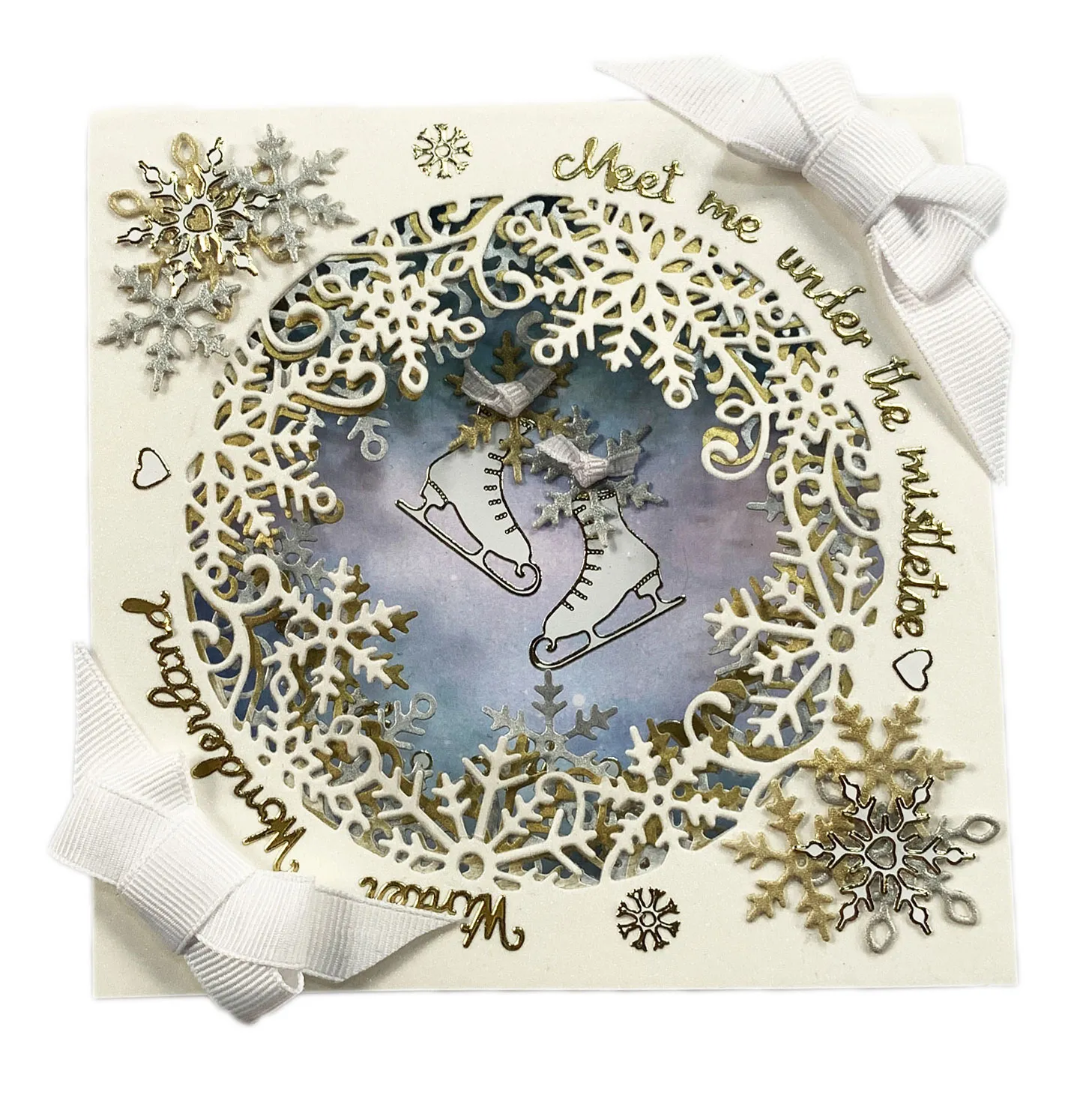 Cut 5”x10” cream Glittering Cardstock, score in the middle and fold into a 5” square card. Center the Frosted Flurry cutting die on the card front and run through the die cutting machine. Die cut two more Snowflakes circles from 5”x5” cream cardstock. Tap to cover one with Midas Gold and one with Midas Silver ink pads. Die cut each with the largest circle from 12 Circle & Scalloped Dies. Die cut the small snowflakes from the set and also ink in silver and gold. Glue the gold and silver circle Frosted Flurry die cuts off set behind the card front to create a denser image. Surround the die cut area with Dazzles™ and the die cut snowflakes as shown. Make two 1 1/2” wide white bows and Zot™ at opposite corners.