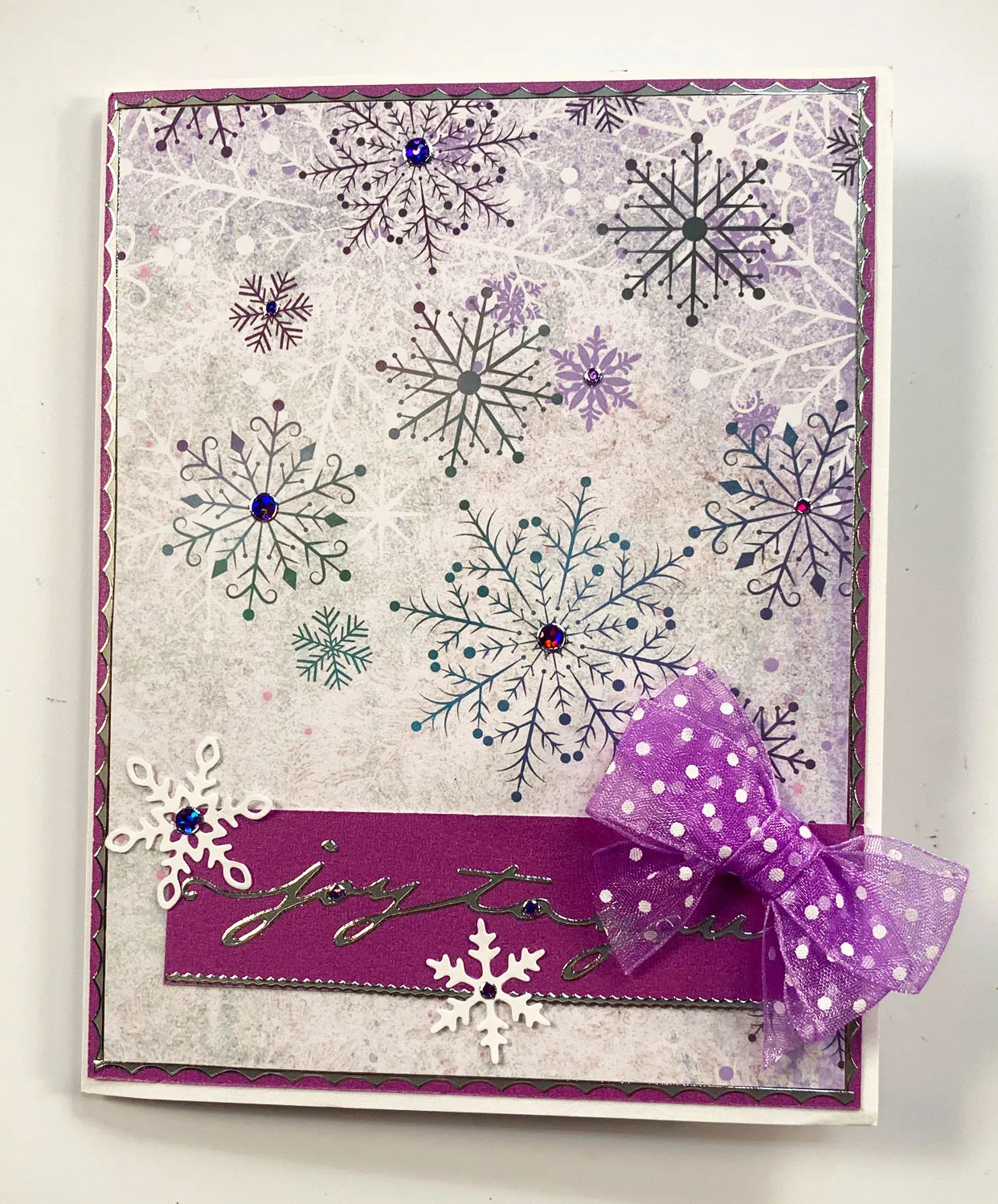 Cut 4 5/8”x6 1/8” snowflake Paper. Mat on purple pearl from the Luxury Cardstock set with 1/* borders. Glue to the card leaving 1/16” white border. Place Thin Line Dazzles™ along the pattern paper edges. Cut 4 1/2”x1 1/4” purple pearl and add Jewel, Thin Line and Greetings Dazzles™ as shown. Zot™ 2” wide purple bow as shown.