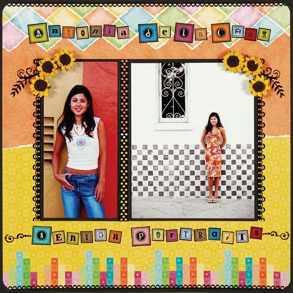 Start with a yellow color block border page with the border along the bottom. Take an orange diamond border page with the border at the top and rip across the center. Glue the orange piece on top of the yellow color block page, with the top edge flush with the top of the page. Trim ¼” off of the right and bottom edges. Round the corners using the ½” Corner Chomper, then mount the whole page onto black cardstock.
