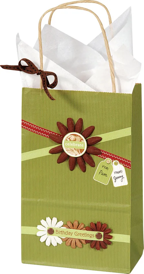 Glue the burgundy stitched ribbon and lime green ribbon from page 17 across the bag 1 ½” from the top, forming an X. Glue a 2 ½” brown fabric flower at the center of the X. Foam tape the “celebrate” circle in the center of the flower.