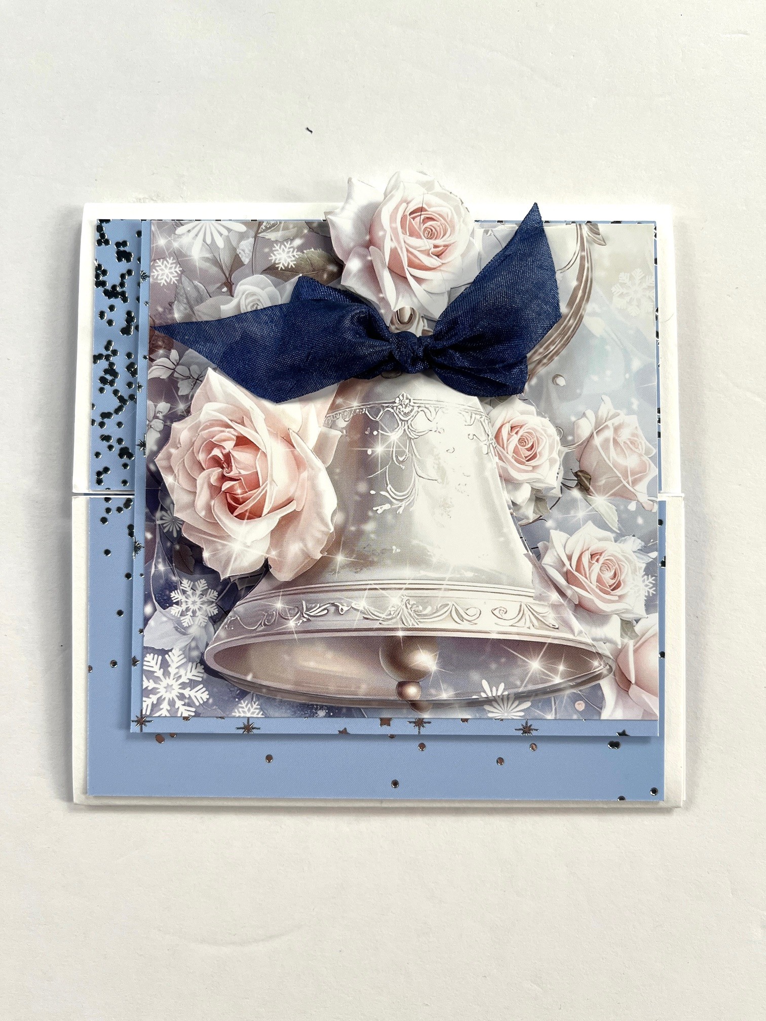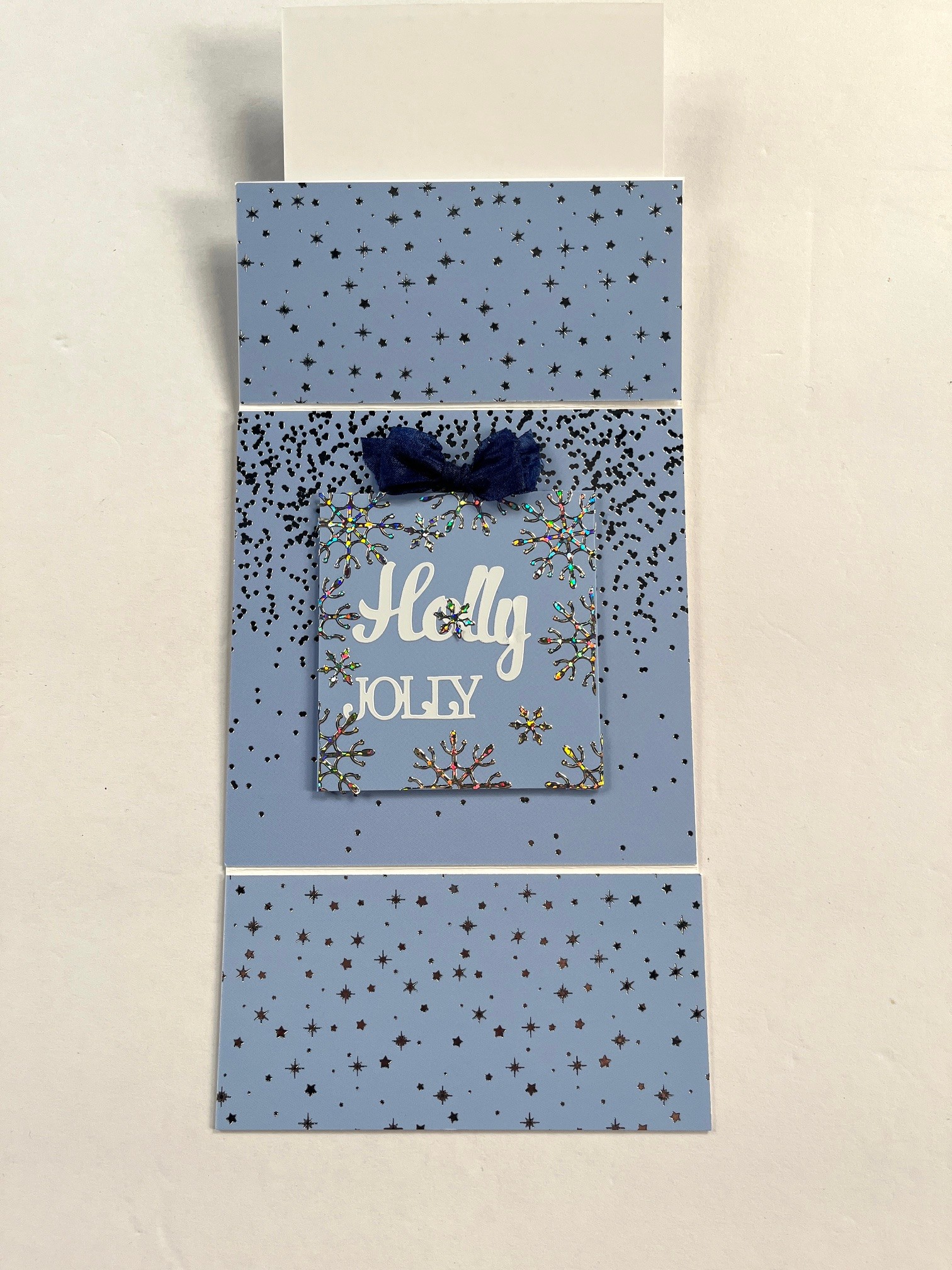 Card inside: Tape the back of gates with the star Luxury Cardstock measuring 4 3/4”x2 1/2”. Tape 5” square piece of silver dots to the center. Cut a 3”x3 ¾” of solid blue cardstock from the scrap cardstock and foam tape to the center. Place “Holly Jolly” Dazzles™ in the center and cover the borders with snowflake Dazzles™️. Make and Zot™️ a 1 1/2” blue bow from the 3/4” Crepe Ribbon Set and place above the sentiment.