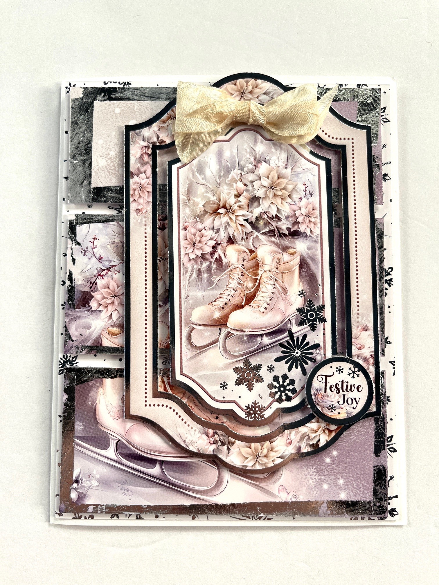 Foam tape 1/4” apart. Foam tape the large Topper Frame as shown. Add a double layer of foam tape to the center ice skates Topper and place in the center. Add a double layer of foam tape to the small Topper and place as shown. Make and Zot™️ a 2” ivory bow from the 3/4” Crepe Ribbon Set and place above the center Topper.