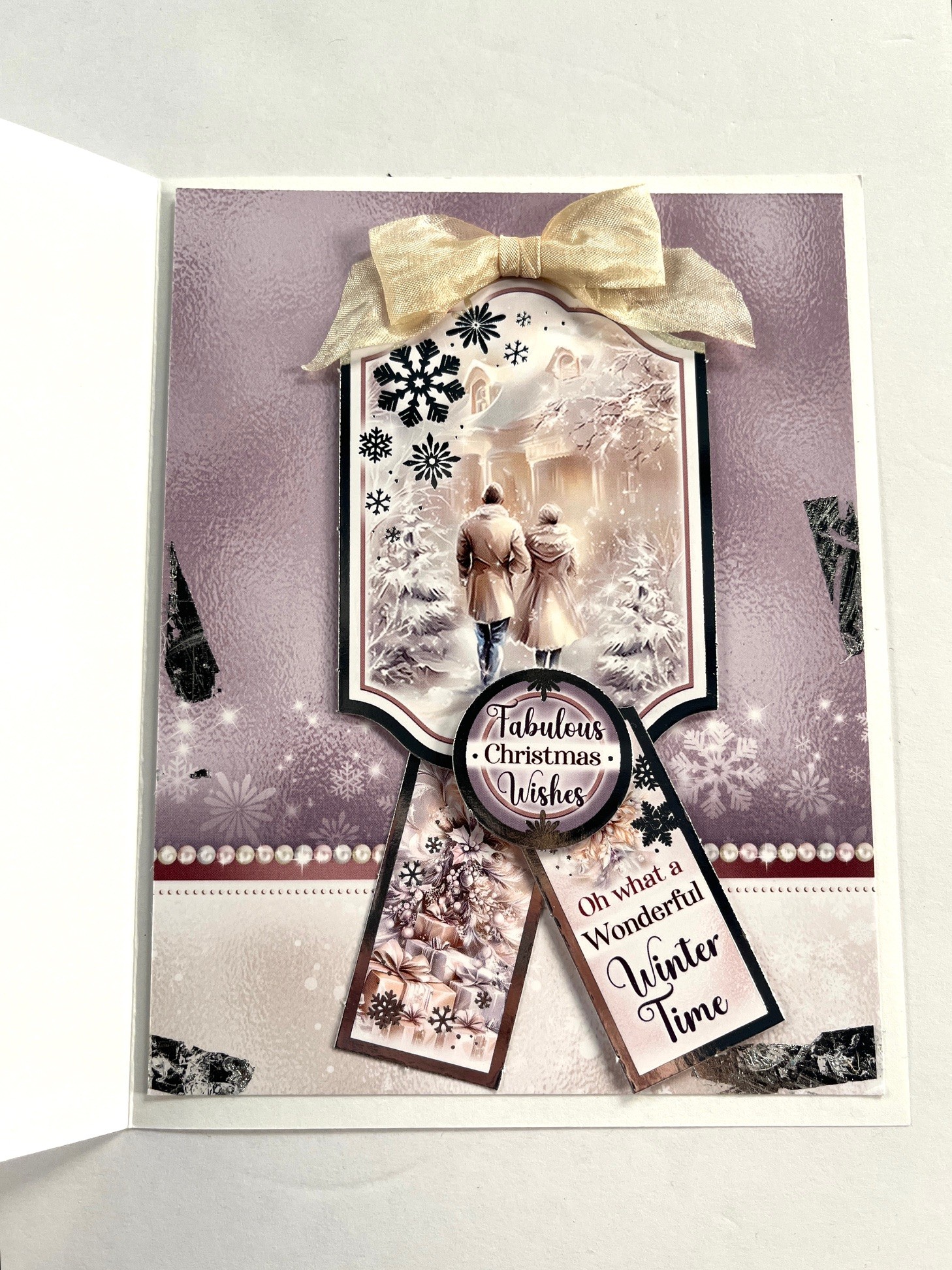 Card inside: Tape 4 3/4”x6” of the remaining Adorable Scoreable leaving 1/8” white borders. Place four dashes of tape on the sides, cover with foil, burnish down and lift off. Foam tape the couple Topper 1” from top. Tape one label and foam tape the right label below the topper. Double foam tape small Topper centered below. Make and Zot™️ 2” wide ivory bow from the 3/4” Crepe Ribbon Set and place above couple Topper.