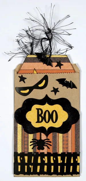 Glue a 3 1/2" x 2 1/2" striped paper rectangle over the bag, 1/2" from the bottom, with stripes vertical. Glue "Boo" frame centered over the top edge of the striped paper. Attach fence sticker to a 1" strip of yellow textured paper. Glue across the bag, 1/8" from the bottom, trimming the edges evenly.
