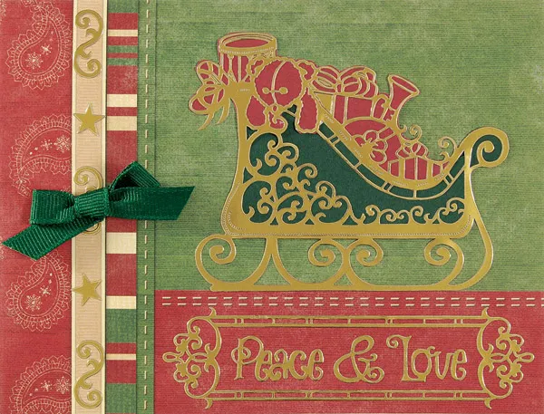 Back the sleigh portion of the sticker with dark green cardstock, and the presents and toys portion with red paper, trimming around the edges. Attach the sleigh to the green section of the card front, centered above the words. Zot a ribbon as shown.