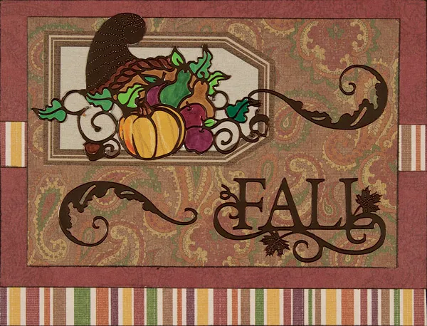 Adhere the “fall” sticker to the bottom right with a swirl to the left. Glue a large brown tag to the upper left and glue the cornucopia, which has been backed and colored with pens. Adhere a swirl sticker to the right.