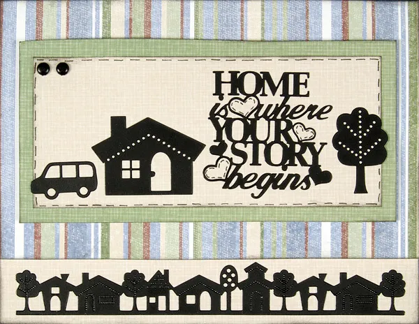 Cut a 5 ¼"x 2 ¼" strip of cream paper and ink the edges. Add Dazzles for the focal, as shown. Mat with green texture paper and ink the edges. Add mini brads to the top left corner of the cream mat, and pen stitching in the hearts and around the edge. Foam tape to the center of the striped paper.