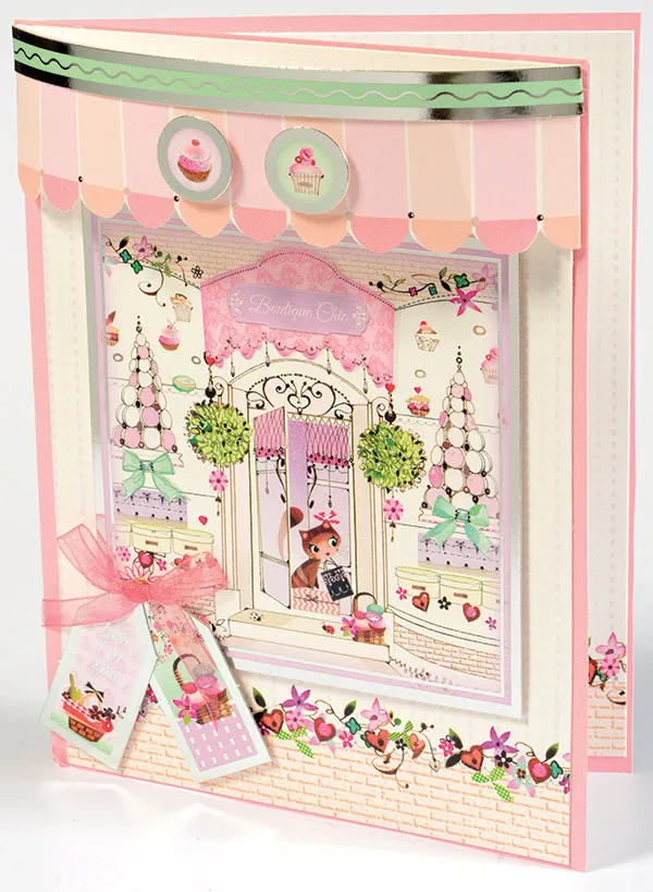 Foam tape the cat with shopping bag square 1 1/8” from the bottom. Foam tape two small labels on the bottom left. Zot a ribbon bow at the top of the labels.