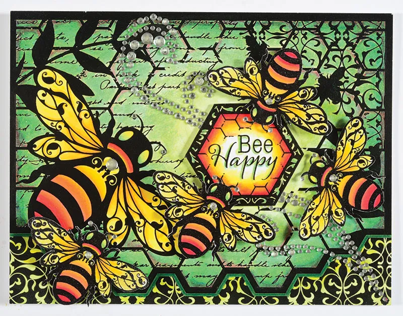 Card front: Place a blank card with the fold on top and glue your card topper in place. Repeat the coloring process on the “Bee Happy” label and foam tape over the open area. Cut the rhinestones to fit above and below the label, as shown.