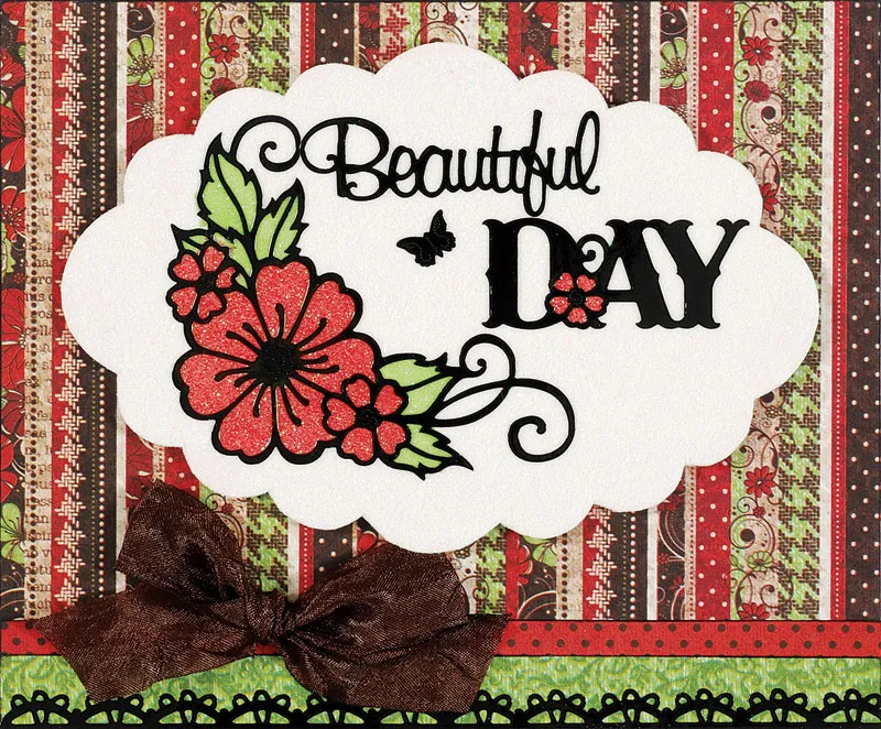 Place your blank card with the fold at the top. Align the striped paper with the bottom and left edges of your card and glue in place. Trim the excess card from the right side and the excess paper from the top (save the excess piece of striped paper for the inside). Cut a 6”x3/4” red/black dots strip and ink the edges black. Glue even with the bottom. Cut a 6”x1/2” green floral paper strip and ink the edges. Glue even with the bottom. Ink the edges of the card. Place a Dazzles™ border even with the bottom edge of the card. Foam tape the glittered shape centered on the card front. Tie a brown crepe bow and Zot™ on the left side as shown.