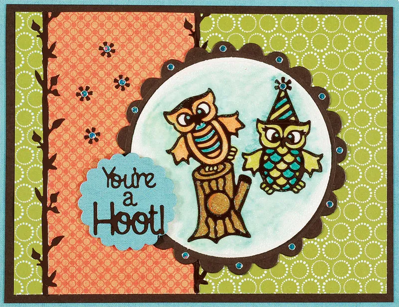 Card front: Place the card fold on the top and cover with Happy Days aqua paper. Glue 2 1/2”x4 1/2” Happy Days orange paper to 6”x4 1/2” Happy Days green circle paper, 1/2” from the left edge. Place Owl Dazzles™ branch border on each side of the orange paper. Mat green circle paper with brown cardstock, leaving 1/8” border and glue to the card front.