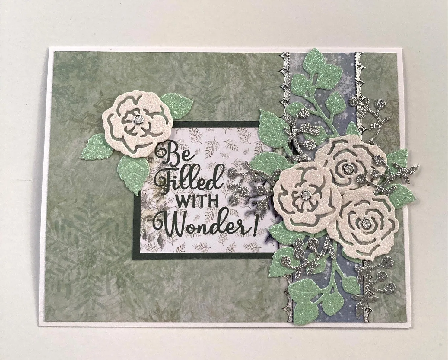 2. Die cut two leaf branches and five leaf sprigs from green glitter cardstock. Glue one branch extending up the blue strip and one extending down the strip as shown. Die cut six berry sprigs from silver glitter cardstock and three roses from white glitter cardstock. Die cut a solid background flower for each open rose die-cut from vellum, then glue the open roses to the vellum background flowers.