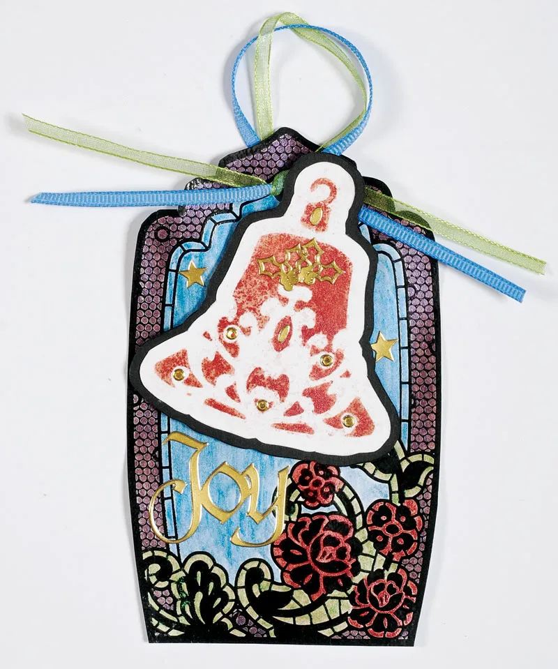 Foam tape the bell on the tag top 1/2” to the right of center at an angle. Place “Joy” Dazzles™ below the bell on the left of the roses on the tag. Place two star Dazzles™ on the right and left of the bell on the tag. Place two holly Dazzles™ centered and next to each other on the bell, above the white detail. Place the inside Dazzles™ of the “o” and “d” in “Holidays” on the top and middle of the bell as shown. Place five Jewel Dazzles™ on the bell in the locations as shown.