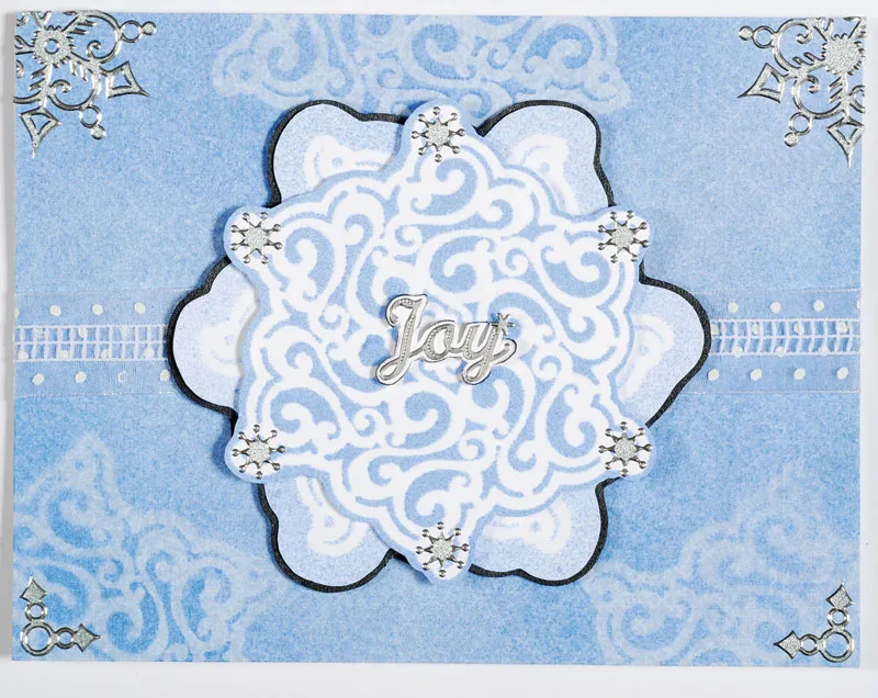 Set the stencil over white cardstock and lightly mist. Move to another area of cardstock and mist again, but this time more heavily. Let dry. Cut out the lightly misted cardstock snowflake, leaving a 1/4” border all around. Mat on black glimmer paper with 1/16” border. Cut out the heavily misted snowflake, leaving a 1/16” border and foam tape over the other snowflake. Foam tape both to the center of the card. Place “Joy” Dazzle in center of snowflake. Place small starburst Dazzles™ on snowflake points. Place corner bracket Dazzles™ on lower corners. Place medium snowflake Dazzles™ on upper corners, cutting off overhanging edges of Dazzles&trade,; as shown.