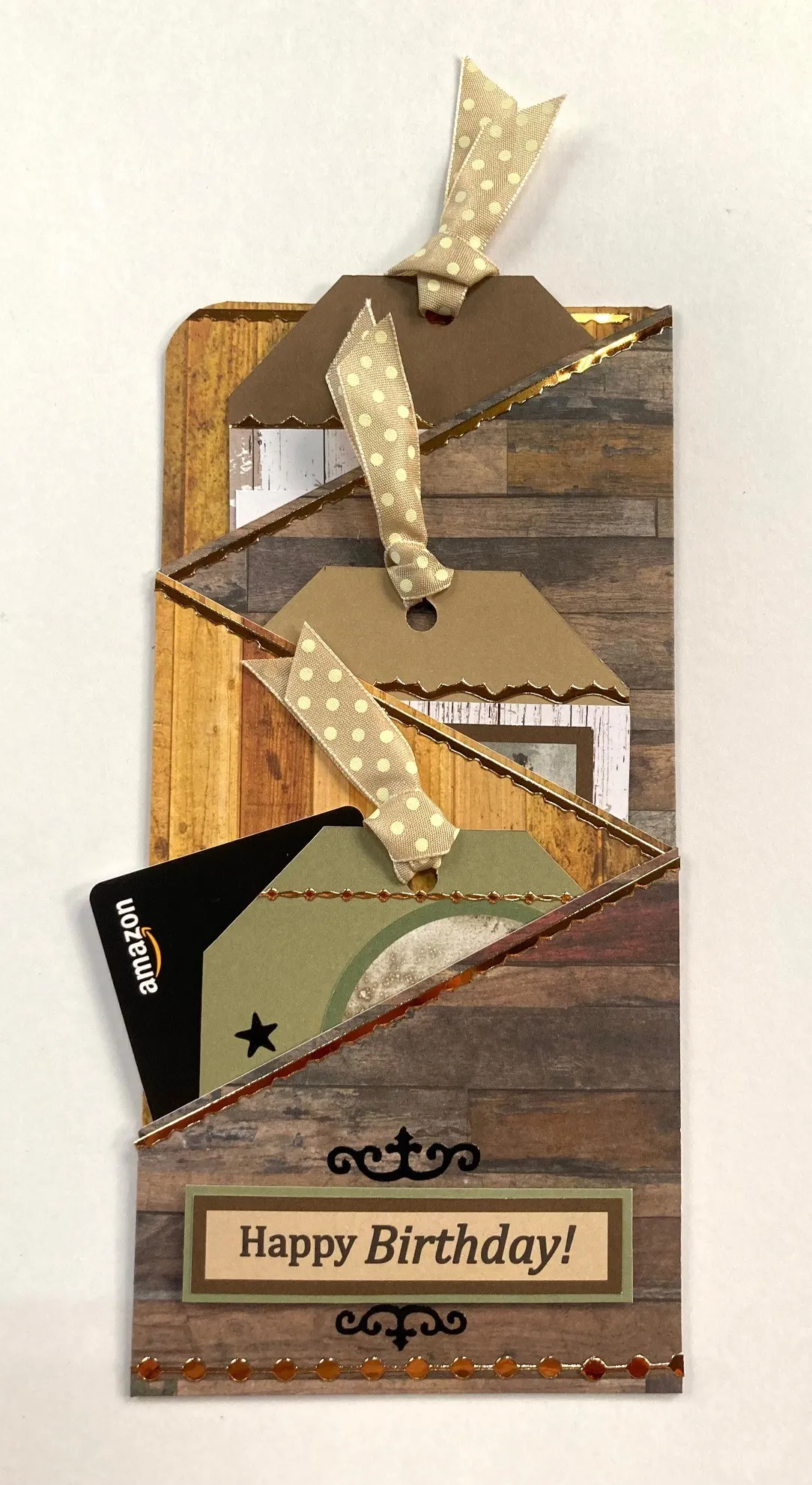 5. Trace and cut the pocket pattern onto the dark wood side of the excess cardstock cut off in step one. Score on the dashed lines and fold those tabs under. Place sticky tape on the tabs and along the back straight edge. Attach this pocket to the card front, aligning the bottom and sides.