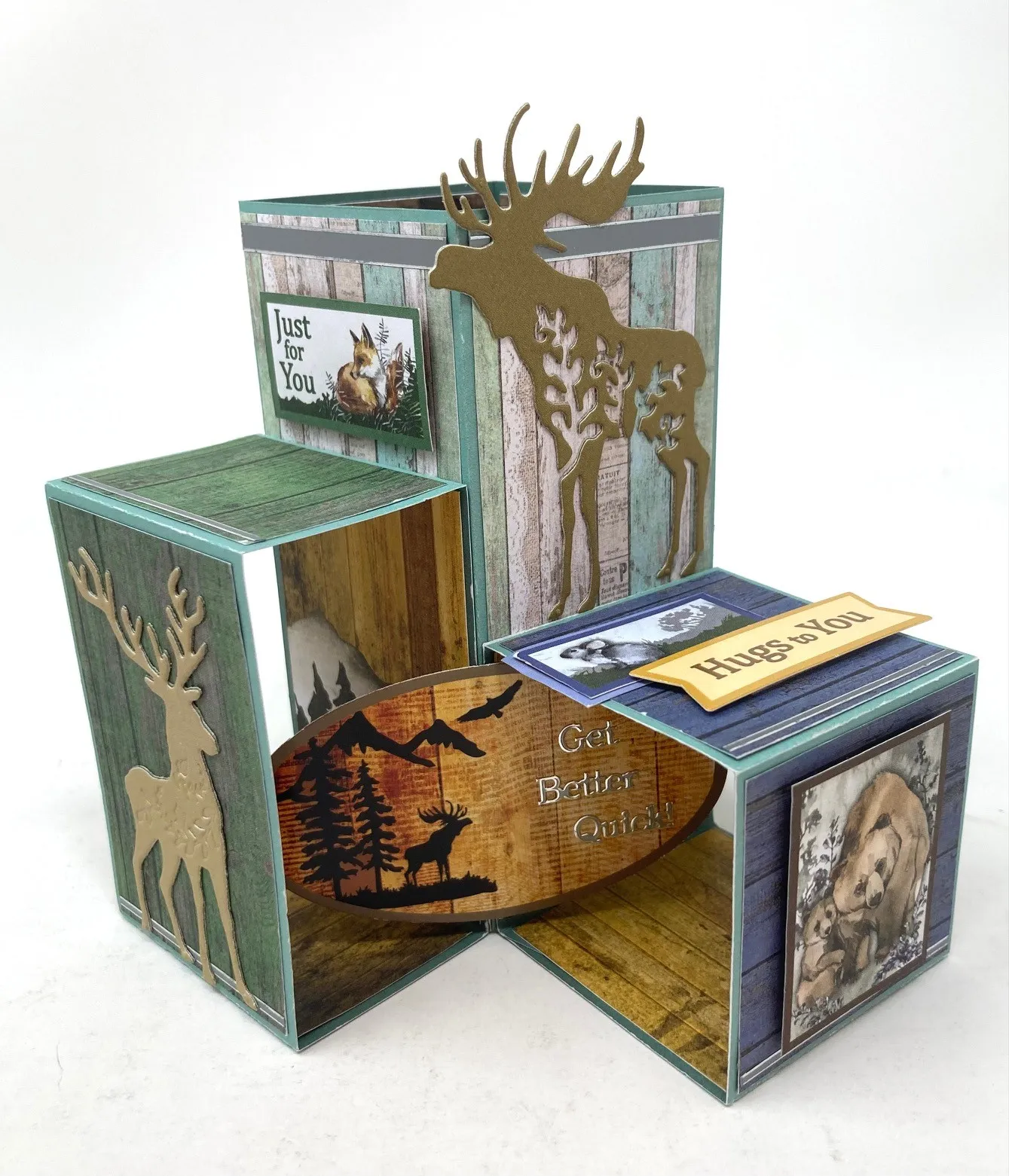 8. Die cut the elk from tan cardstock and the moose from medium brown cardstock. Glue them to the panel fronts as shown. Foam tape the bear cutout to the blue cube on the front panel and the “just for you” sentiment on the tall cube as shown. Glue the mouse cutout and foam tape the “hugs for you” die-cut on the top of the blue cube as shown. To flatten the card, push the small and medium cubes upward while flattening the tall cube.