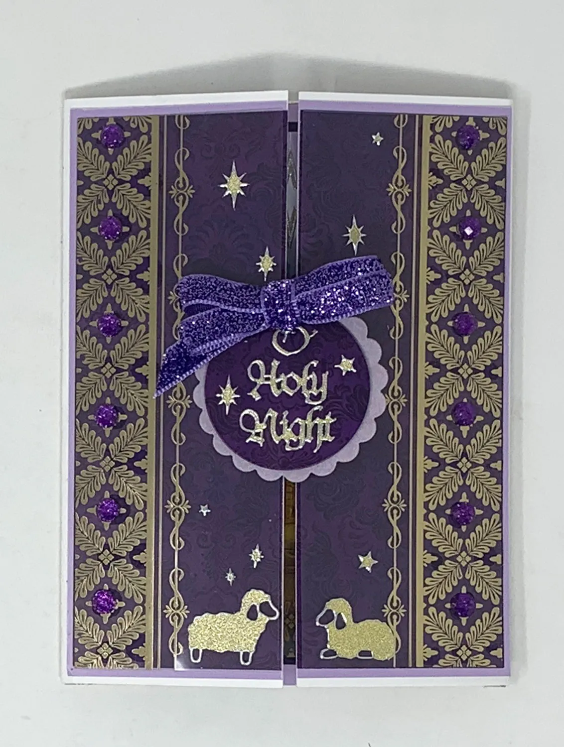 Attach the purple Diamond Sparkes along the borders of the acetate as shown. Die cut a small scalloped circle out of the purple Adorable Scorable. Die cut a small circle from a piece of the purple double sided Insert paper. Foam tape these together and attach to the left side of the gate folds. Zot™️ a 2 1/2" wide purple bow to the top of this piece. Place Dazzles™️ as shown.