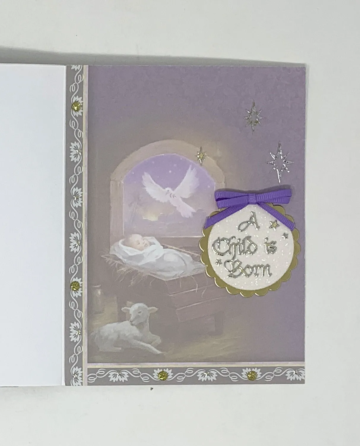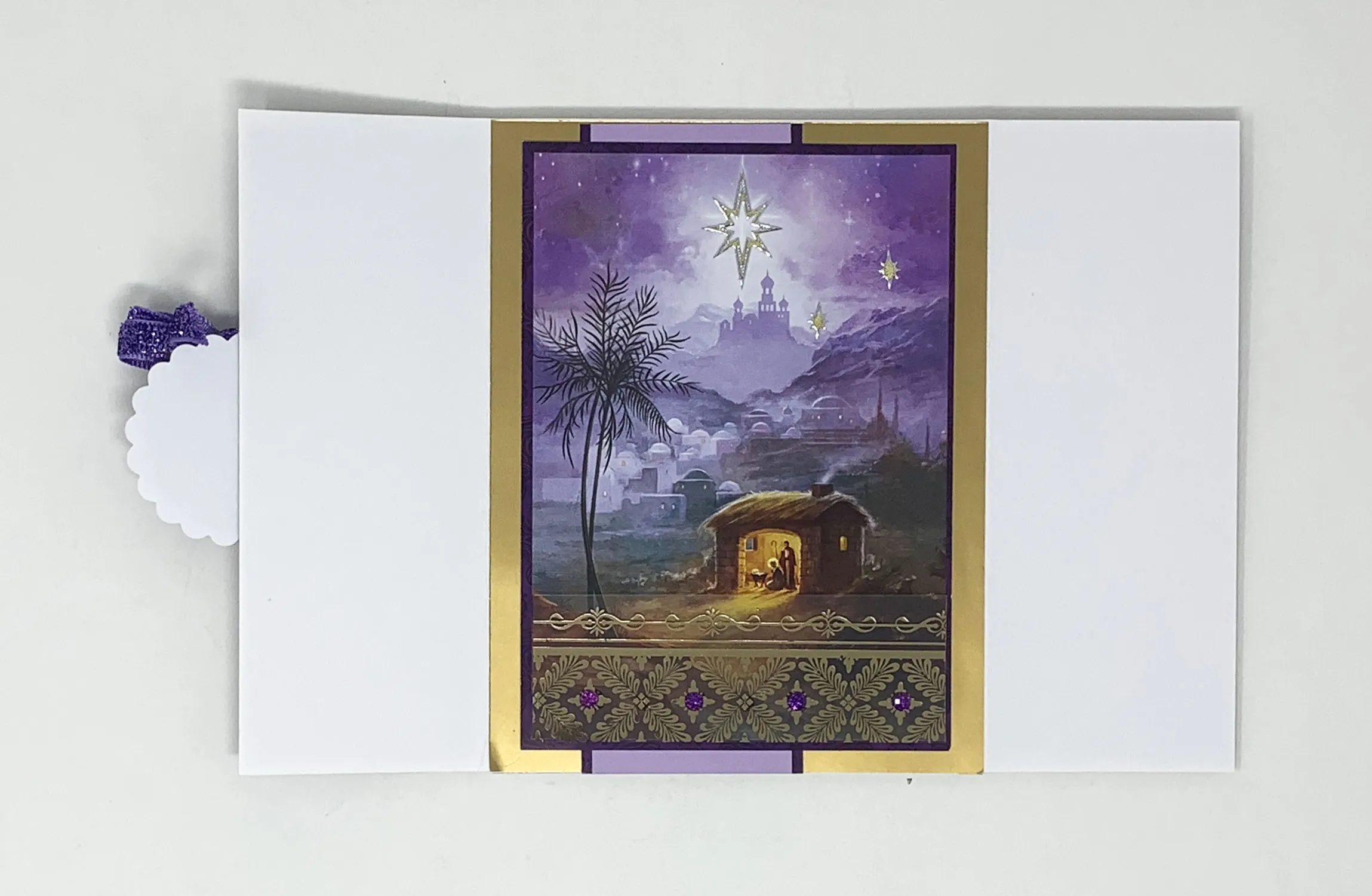 Card Inside #2- Cover entire inside base with glue, position the insert and trim off the excess. Die cut a small scalloped circle out of the gold paper and a small circle out of the white glitter sheets then glue together. Glue to card as shown and Zot™️ a 1 ½” wide bow at the top. Place the Dazzles™️ sentiment in the center of the small circle. Place Dazzles™️ and Diamond Sparkles along the borders.