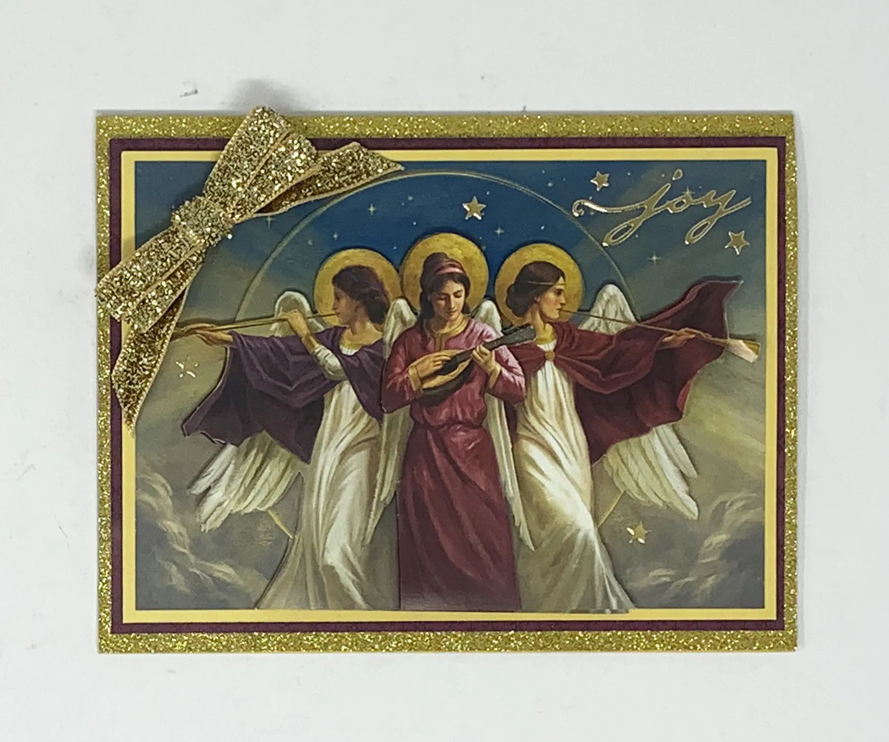Glue the Angels image from the Bite Size Book to yellow Adorable Scorable and trim leaving 1/8" yellow border. Glue to dark red double sided Insert paper and cut leaving a 1/16" red border. Glue to the Gold glitter card leaving a gold border.