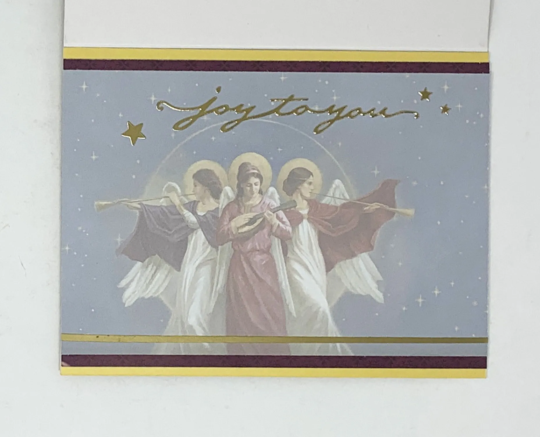 Cover the inside with glue, lay the yellow Adorable Scorable, and cut off the excess. Cut 6 ½”x4 ¼” angels Insert paper and mat on dark red Insert paper leaving 1/8" red border. Glue this to the yellow Adorable Scorable and trim off so this piece is flush to the sides. Trim off a 1/16" strip from the Dazzles™️ sheet and place across the angels as shown. Place the “Joy to you” Dazzles™️ sentiment and stars as shown.