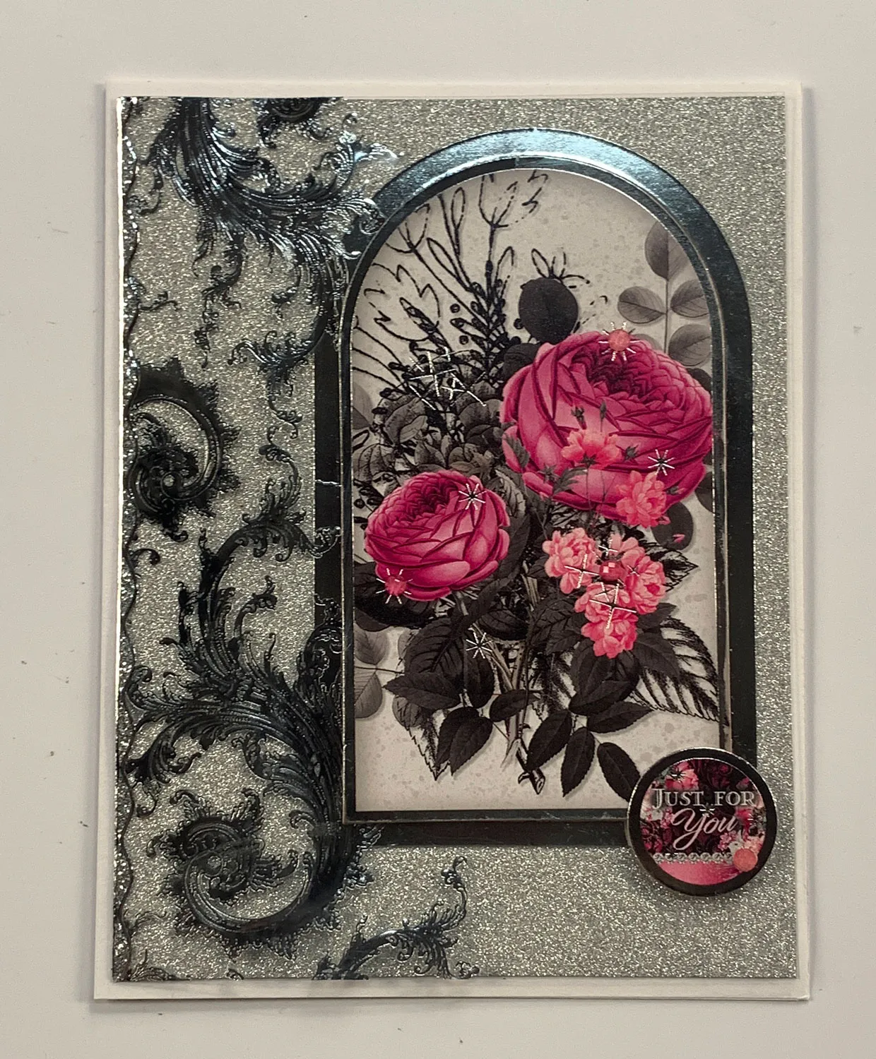 For the card front: Place the card with the fold on the left. Cut 4¾"x6¼" each from Rose Quartz Dreams flourish border acetate and from the Silver shimmer cardstock. Glue the shimmer cardstock centered on the card front.