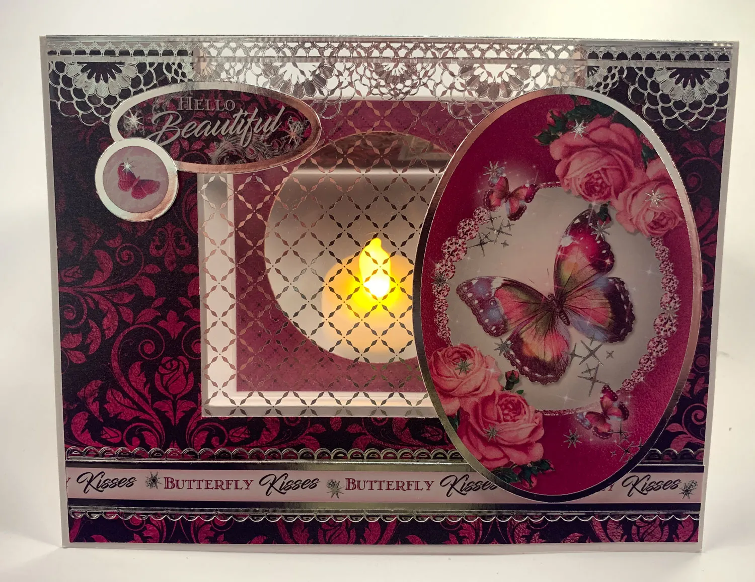 Punch out the Rose Quartz Dreams butterfly kisses border die-cut and glue it on the Dazzles™ border center, trimming the excess. Glue the paper centered on the card front.