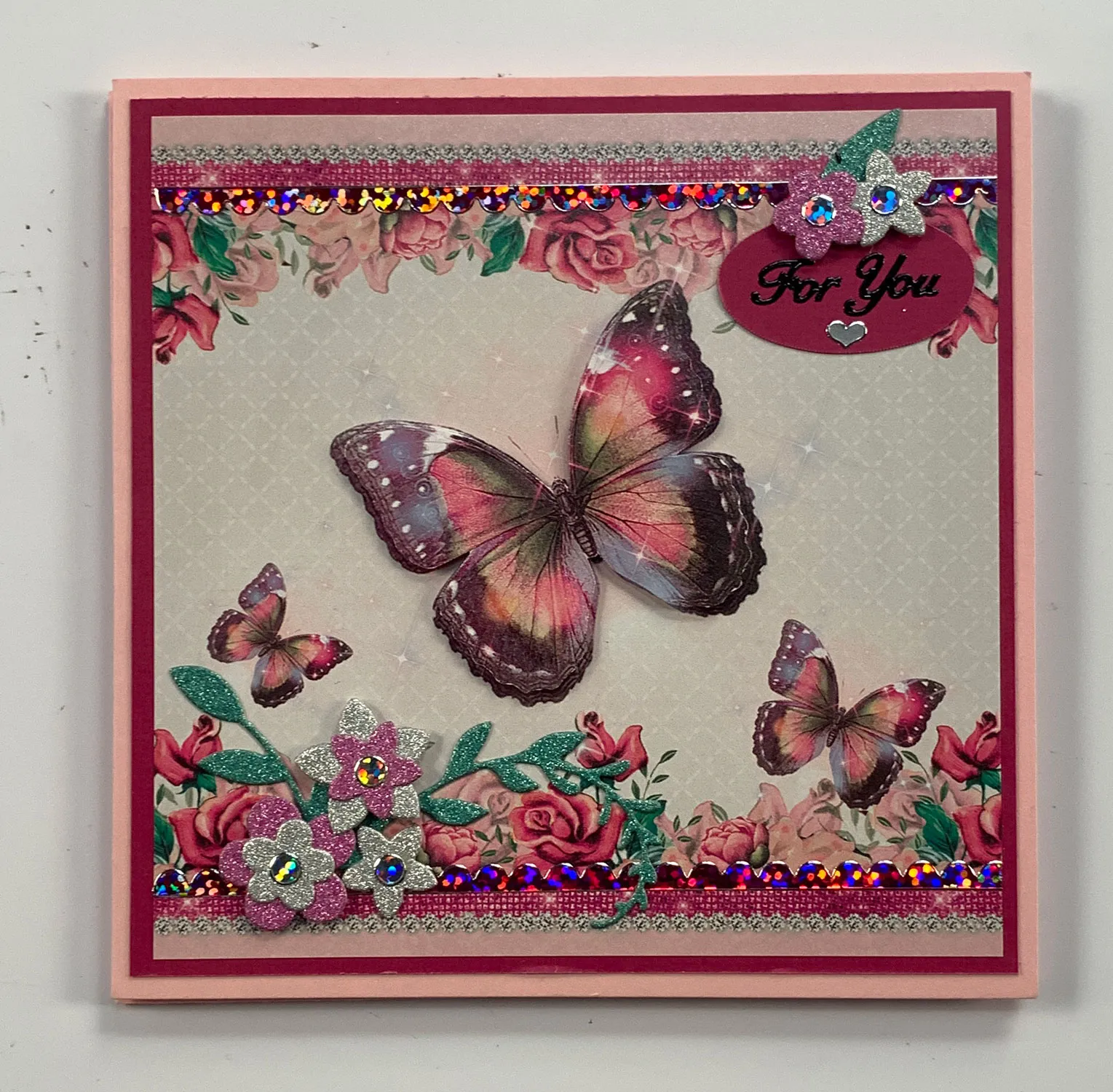 Remove another butterfly page from the book and cut out a 2 1/8"x1¾" butterfly. Foam tape it over the large butterfly on the card front. Trace and cut the oval label pattern (shown below) from rose cardstock. Place black “for you” and a silver heart Dazzles™ on it, then glue the label as shown.
