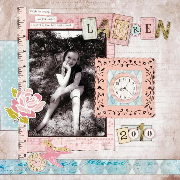Glue a 10” length of pink measuring tape ribbon to the left of the photo. Foam tape a large pink flower die-cut near the bottom of the photo, over the ribbon. Glue a small clock and pink bird to the left side of the blue border. Glue a knotted length of yellow dot ribbon to the bird.