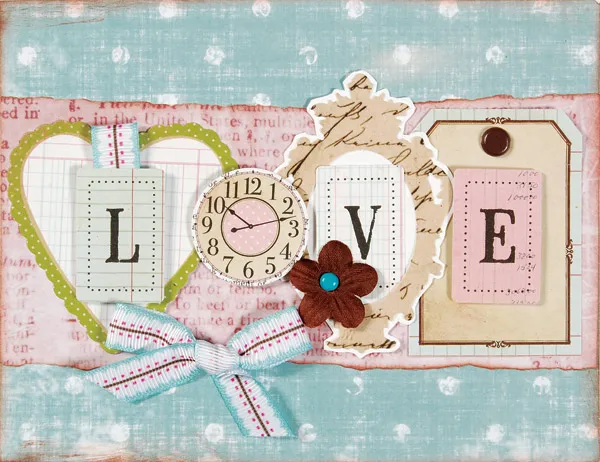 Foam tape a small clock between the heart and frame. Glue a length of folded ribbon to the top of the “L” die-cut and foam tape to the heart. Foam tape an “E” to the blue edged tag. Glue a bow to the left side of the bottom torn edge.