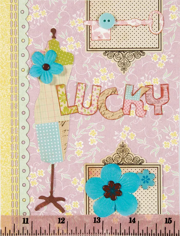 Secure a small blue flower with a brown round mini brad to the dressmaker’s dummy and glue to the right of the border. Cut the black dot frame in half. Glue half at the top of the card with the cut edge flush with the card edge. Glue a pink key die cut and button to the frame. Secure a large blue flower with a brown flower brad and a blue flower brad to the remaining frame. Glue to the bottom of the card above the ribbon border and opposite the top of the frame.