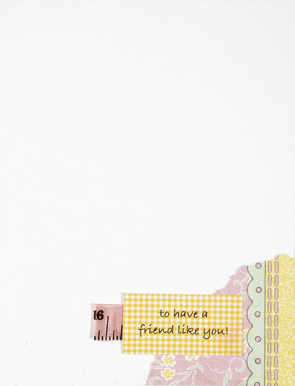 Print the inside greeting on the yellow gingham die-cut and glue a folded length of measuring tape ribbon to the left side. Glue the gingham overlapping the torn corner.