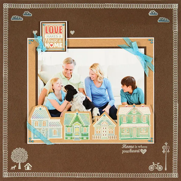 Cut around the top edges of the houses, leaving a 1/8” border. Foam tape the strip along the bottom edge of the photo matting. Wrap ¼” blue sheer ribbon across opposite corners of the piece, tying a bow at the top right, as shown. Glue the piece centered on your background.