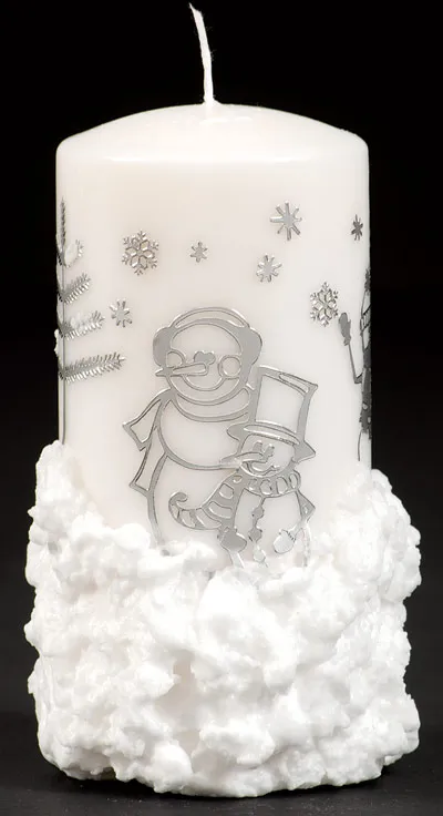 Heat up the wax and let cool slightly. When cool whip with the beater or a fork. Gently spread the wax onto the bottom of the candle and a few dots on the trees.