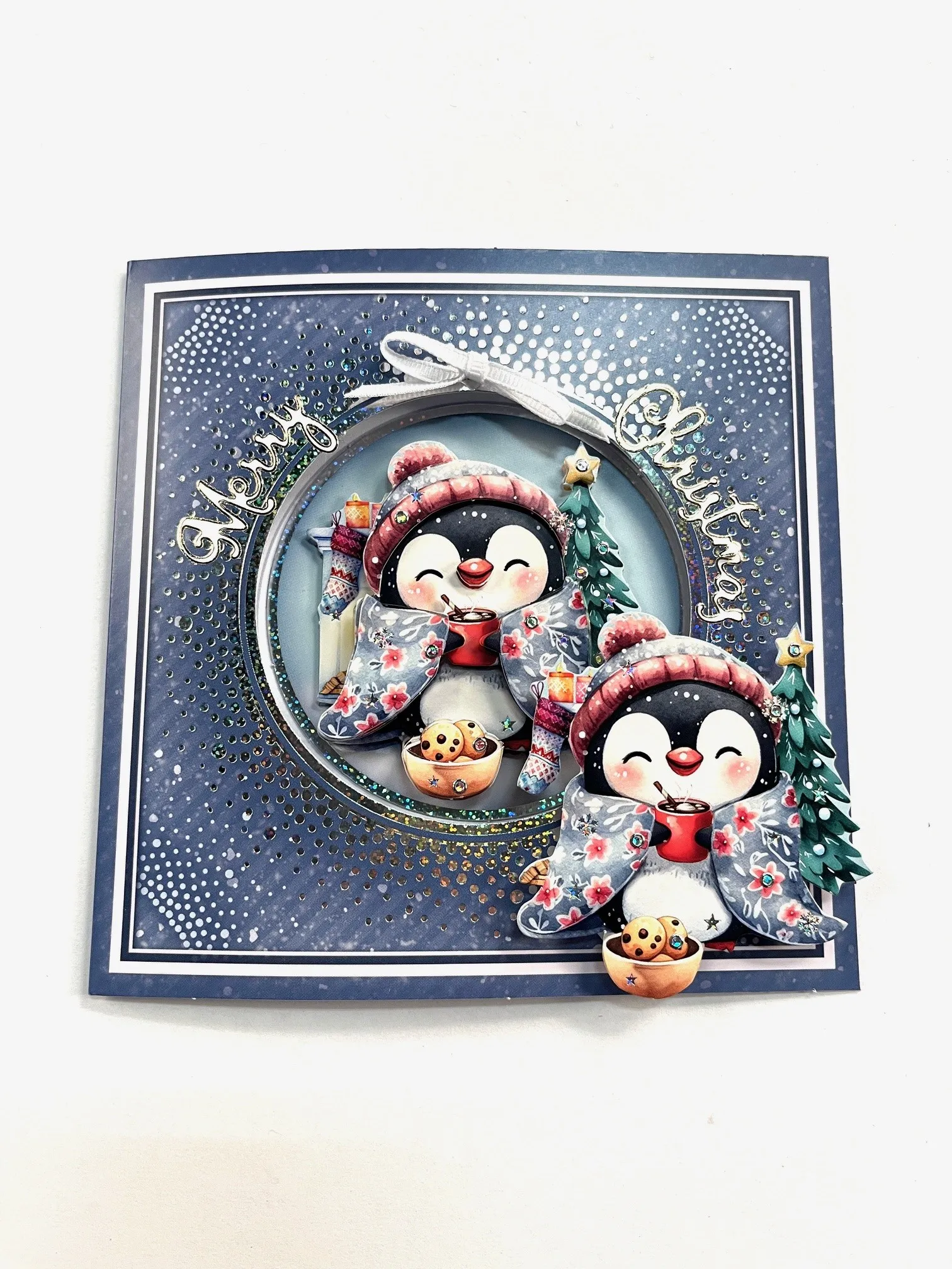 We’ll use the “Cosy Christmas” sheet. Save the penguin that’s on the right for the end. Foam tape the penguin with trees over the circle image. Foam tape the other pieces on the matching art. Foam tape “Cosy Winter Wishes” on the upper right. Place silver Jewel Dazzles™ around the circle and on the image as shown.