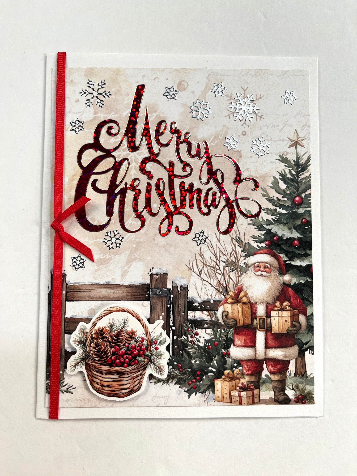 1. Cut the Santa Christmas Tree Farm paper to 4 ¾”x6” and glue to the card front. Foam tape the basket die-cut in front of the gate. Place red Merry Christmas Dazzles™ on top and surround with white snowflake Dazzles™. Wrap 1/8” red ribbon from the Red Ribbon set around the card and tie a knot.