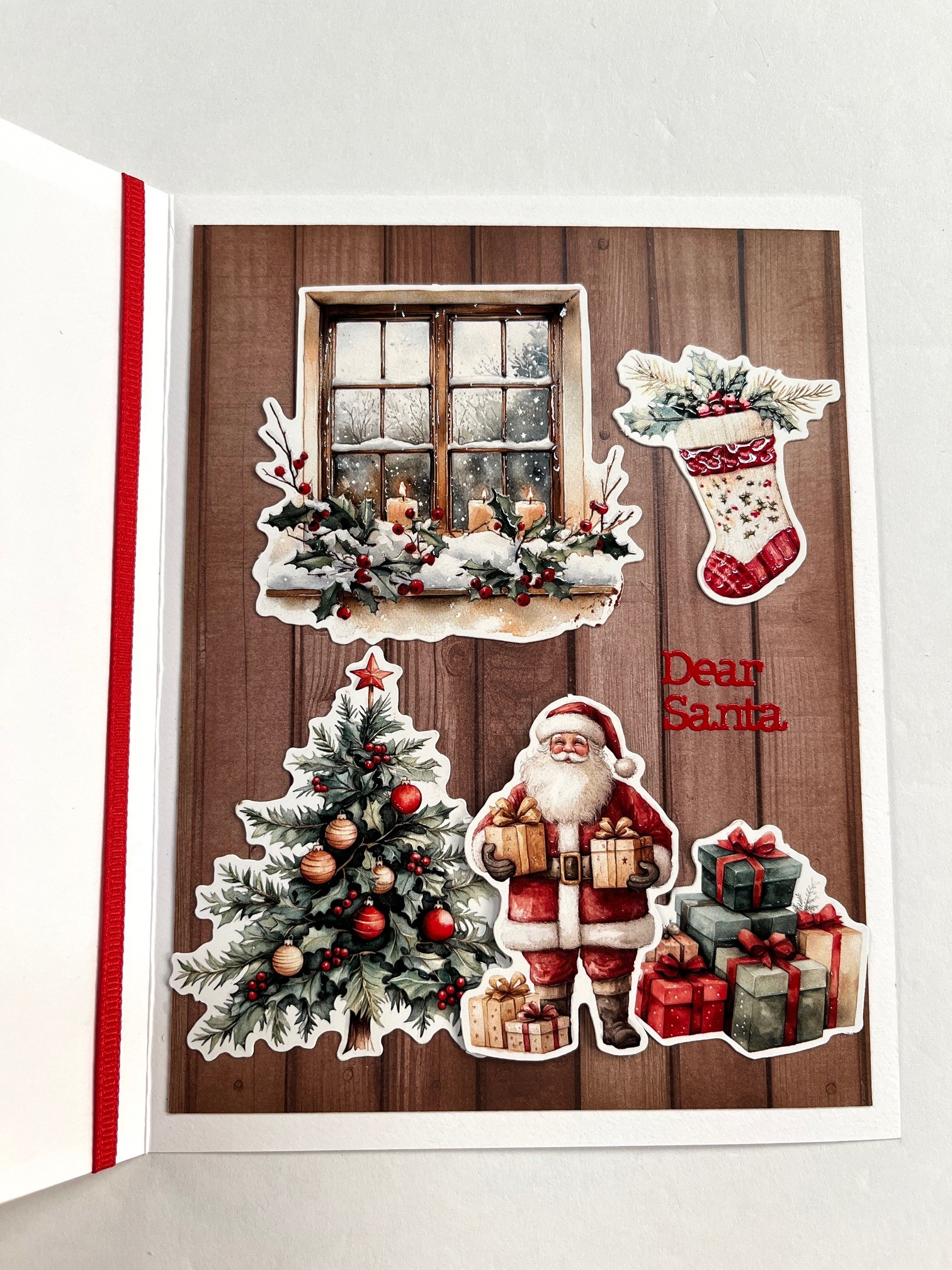 3. Glue the window, stocking, presents and tree die-cuts as shown. Foam tape the Santa die-cut in the center. Place “Dear Santa” red Tiny Words & Phrases as shown.