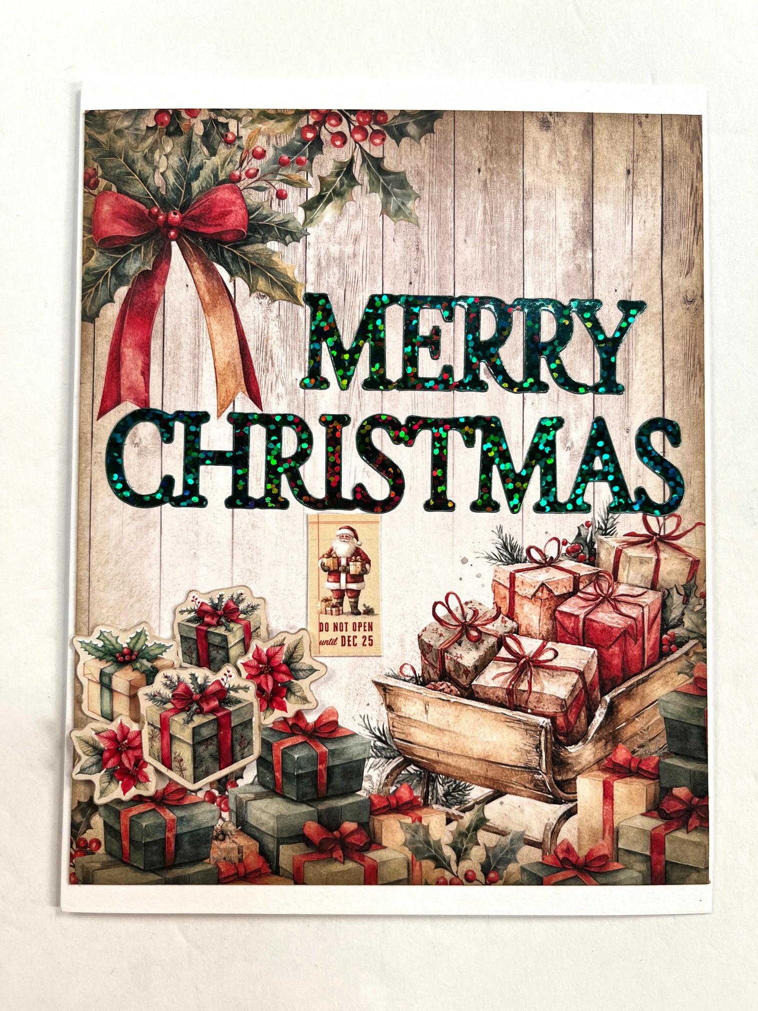 2. Place green “Merry Christmas” above the sleigh. Cut out a small “Do not open until Dec. 25” and glue below the greeting.