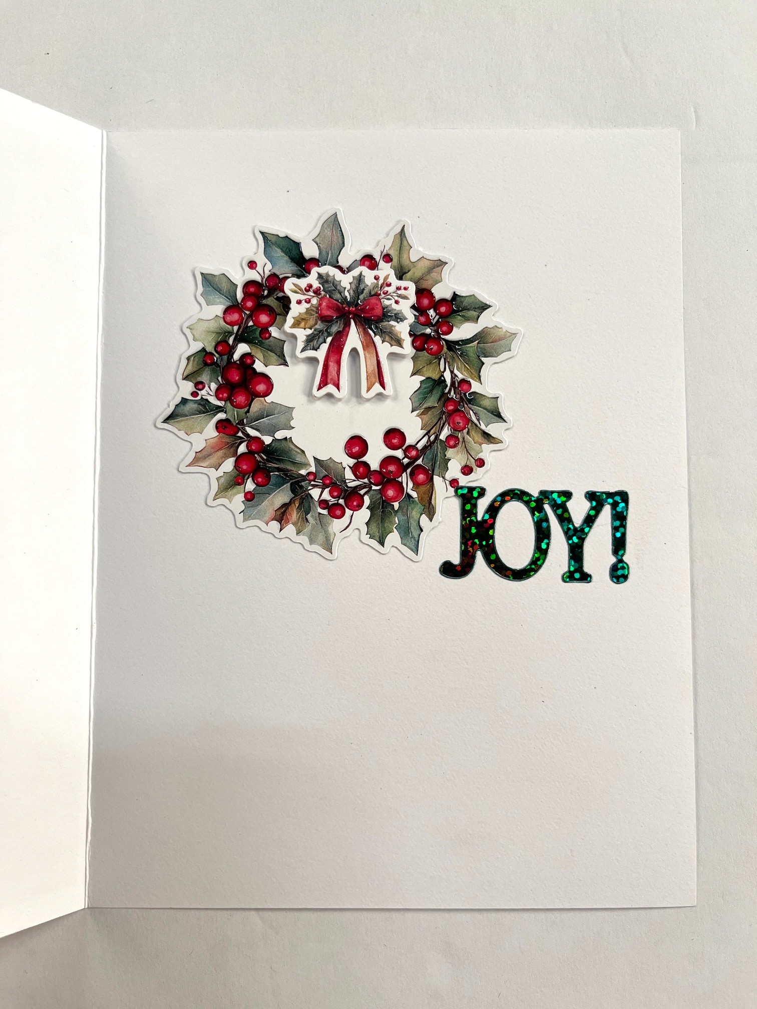 3. Inside: Glue the wreath die-cut and foam tape the bow die-cut at the top. Place green “JOY!” on the lower right.