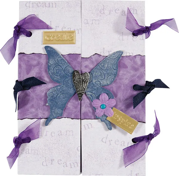 For the cover focal: Apply blue ink to the surface of the large butterfly wings and black ink to the small heart. Punch a 1/16” hole and secure a small lavender flower. Glue the gold embossed tags as shown.