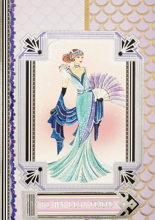 Inside: Mat 3”x4 3/4” Violet Suede paper with black cardstock, leaving 1/8” border and glue to the card center. Place lengths of Purple Jewel Border Dazzles™ along the top and bottom of the rectangle, as shown. Tape the “Just For You” coordinating image from the Special Moments die-cut sheet to the center of the suede paper and foam tape the “Happy Birthday” die-cut circle from the Most Elegant Of Friends die-cut sheet to the bottom right as shown.