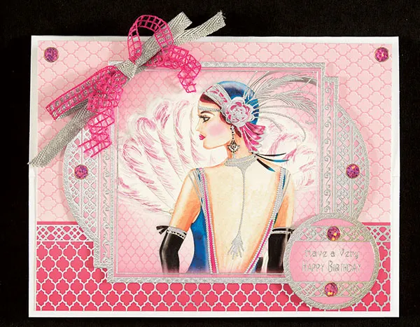 Foam tape the large pink image for the A Fabulous Day Out die-cut sheet to the pink rectangle as shown. Foam tape the die-cut circle greeting, “Have a Very Happy Birthday” to the bottom right. Embellish die-cuts with Pink Jewel Dazzles™. Hold 1/4” wide lengths of dark pink grid and silver metallic Honeysuckle ribbon together as one and tie a bow. Zot™ to the top left corner of the card.