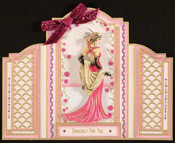 Foam tape the die-cut layers of the woman in evening gown. Use a length of 1/2” wide dark pink glitter Honeysuckle ribbon to make a bow and Zot™ to the top left as shown.