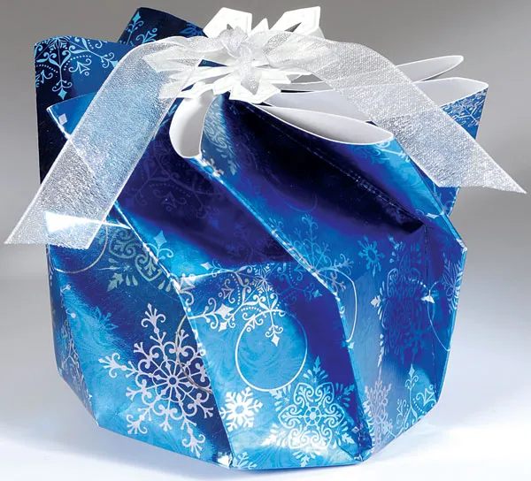 Tie a Snowflake to the top of the box with the ribbon.