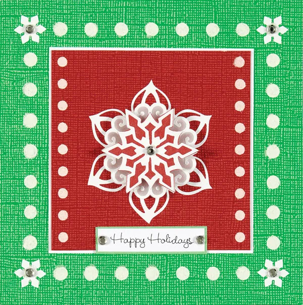 Write or computer print "Happy Holidays" on white, trim to a rectangle, and mat on the smooth side of the green cardstock. Glue below stacked snowflake as shown. Add crystal stickers to snowflakes and word rectangle as shown.