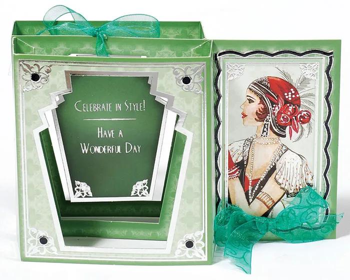 Punch a hole at the top of the greeting cut-out and thread with 12” of 1/4” wide Gypsy Jewel green sheer ribbon. Place the greeting in the die-cut window and tie a bow at the top of the card. Fold flat to place in envelope.