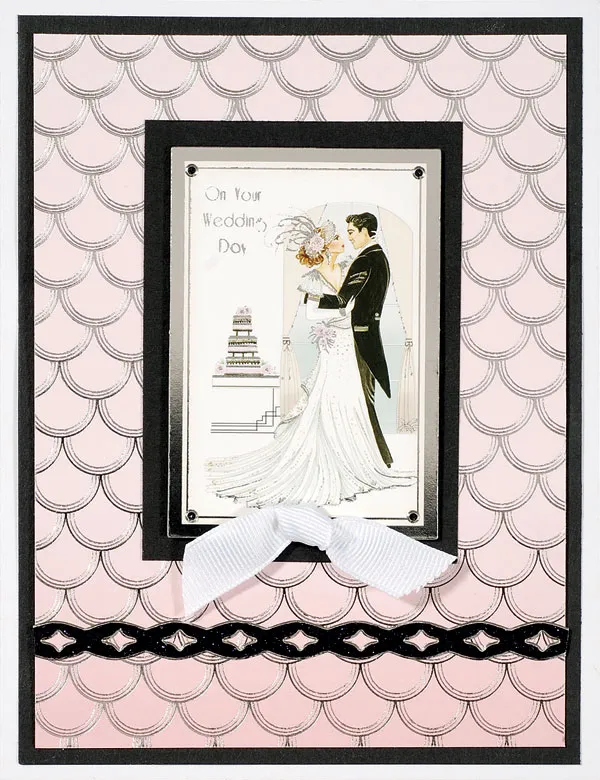 Mat with black cardstock, leaving 1/8” border and glue to the card front. Mat the Wedding Lovely Ladies die-cut on black cardstock, leaving 1/4” border. Glue to the card center, 1” from the top. Place tiny Black Jewel Dazzles™ on each corner.